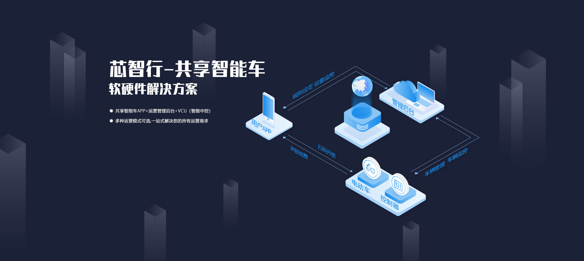共享智能車APP + 運(yùn)營(yíng)管理后臺(tái) + VCU(智能中控)= 一站式解決方案